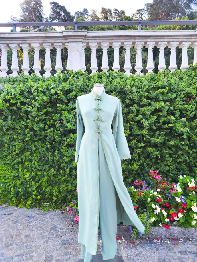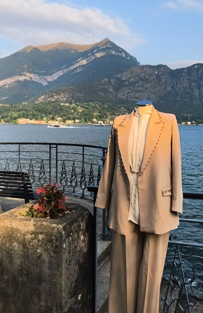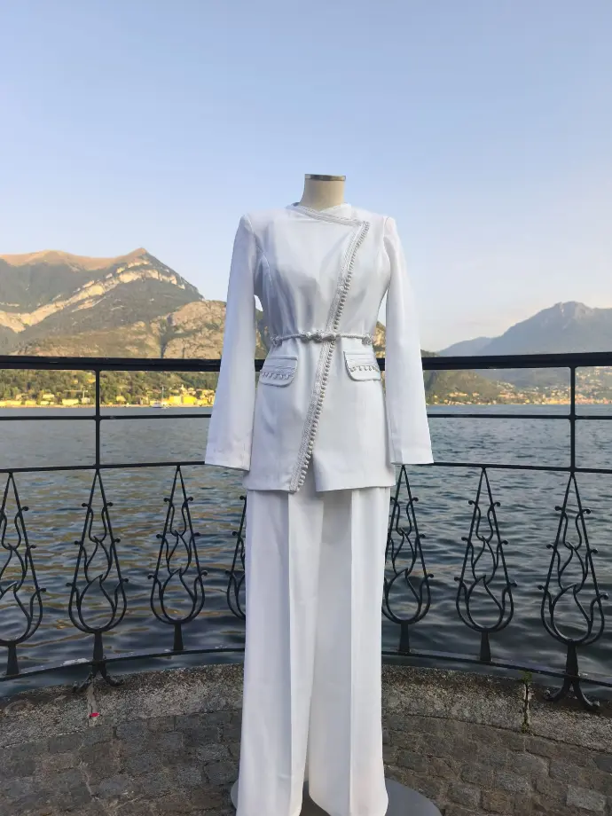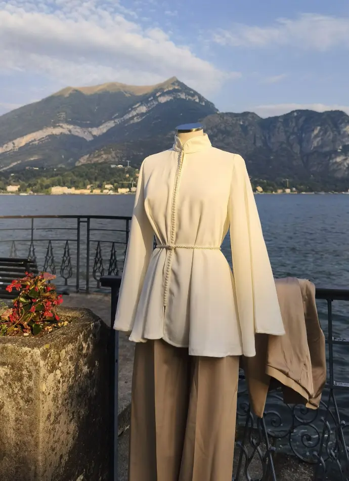 A blazer and trouser set in neutral tones, enriched with Moroccan-inspired details around the lapel that highlight its elegance and artisanal uniqueness.